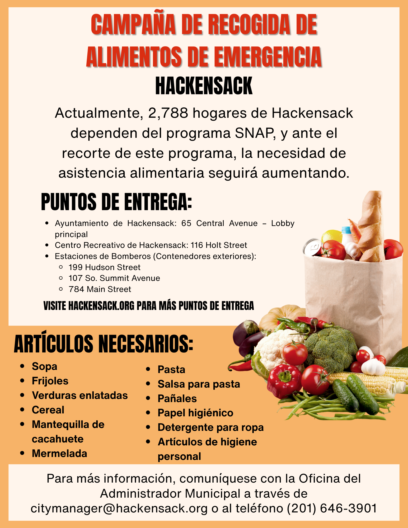 Hackensack has the greatest number of families receiving SNAP benefits in Bergen County, underscoring the urgency of this effort. To best support this Emergency Food Drive, the City has collaborated with Bergen County officials, as well as the public schools, local clergy, nonprofit civic organizations, and small businesses.