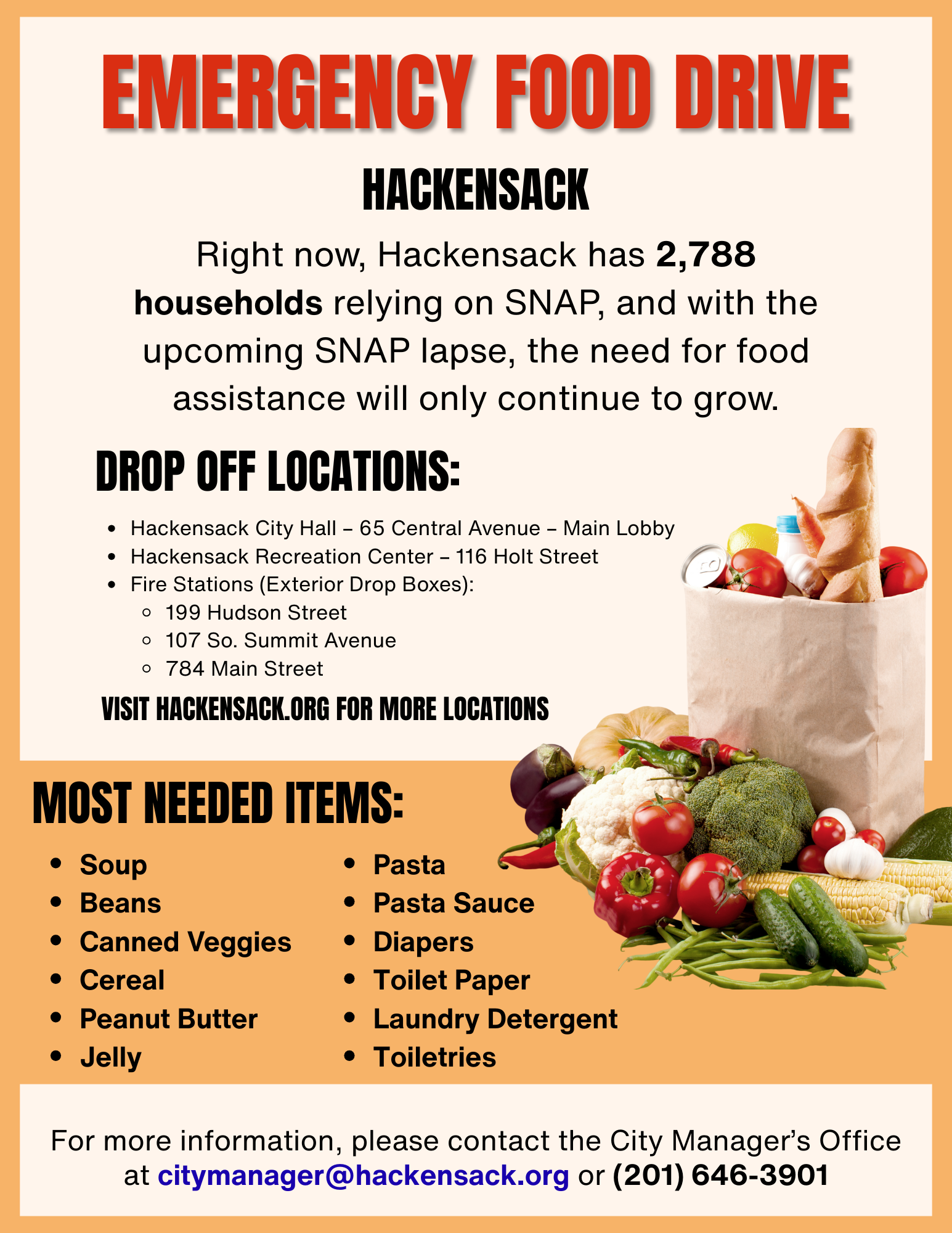 Right now, Hackensack has 2,788 households relying on SNAP, and with the upcoming SNAP lapse, the need for food assistance will only continue to grow. Join us in supporting our community by donating essential items to help families through this critical time.