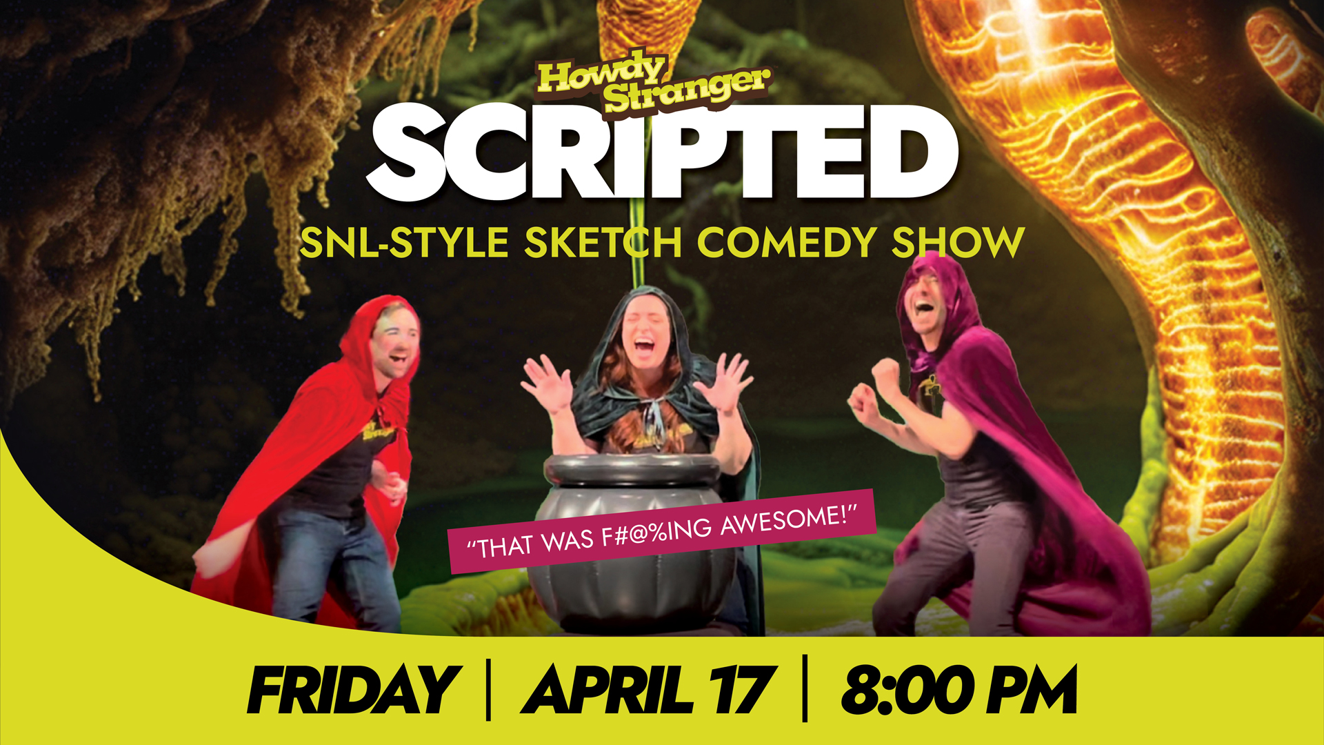 Experience Howdy Stranger’s hilarious sketch comedy show, 8PM on Friday, April 17th and Saturday, April 18th, at HACPAC.
