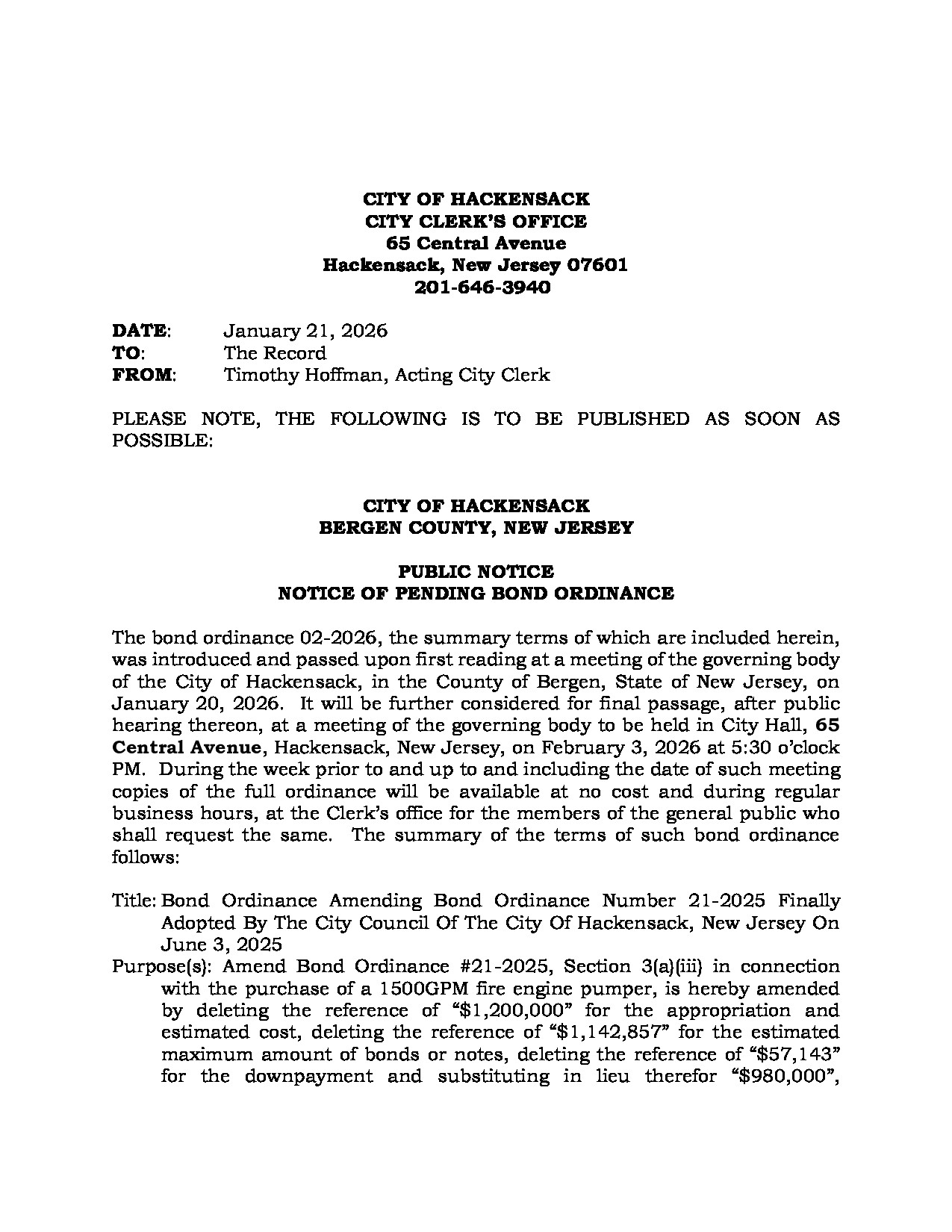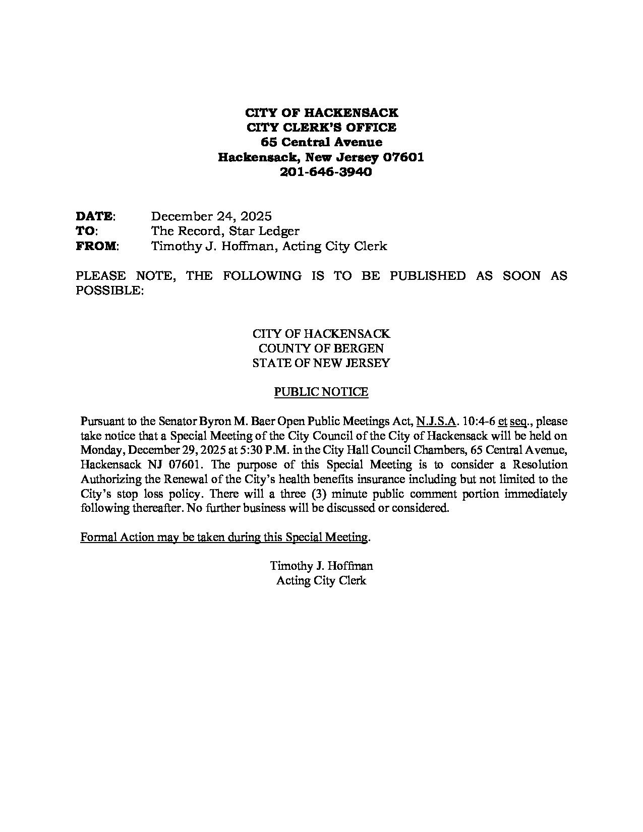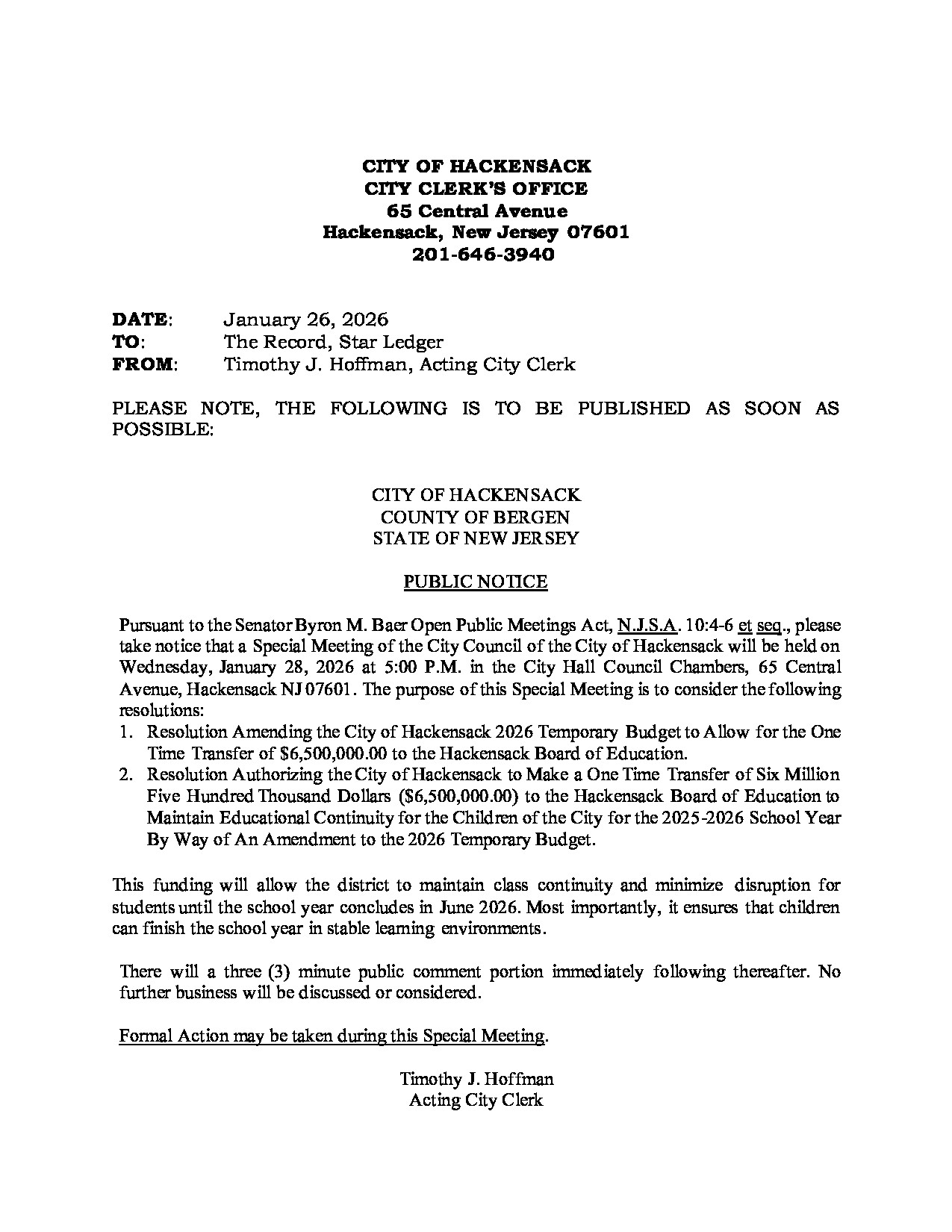 Please be advised that pursuant to New Jersey P.L. 2025, c. 72 (formerly Senate Bill 4654), the City of Hackensack will be transitioning the publication of all legal and public notices to its official website. This change is being made in accordance with new state law, which recognizes that online publication provides more accessible and cost-effective access to public information for a greater number of New Jersey residents.