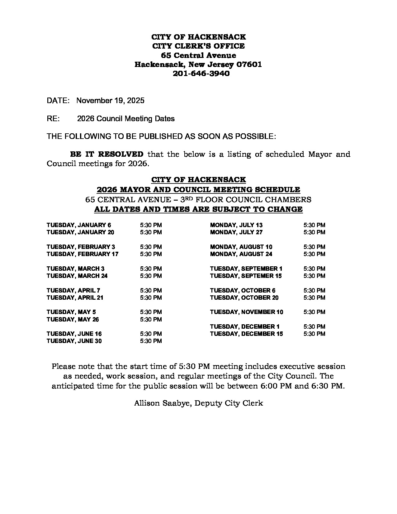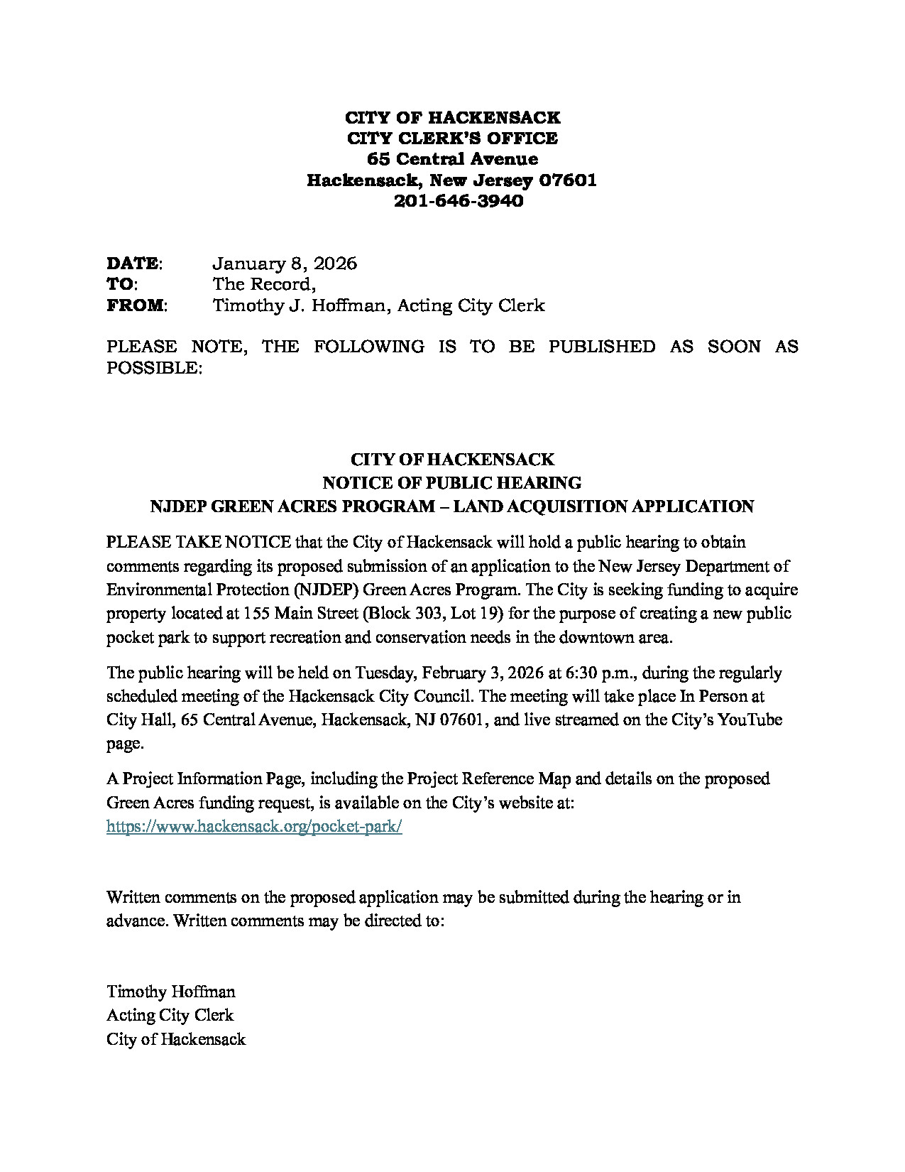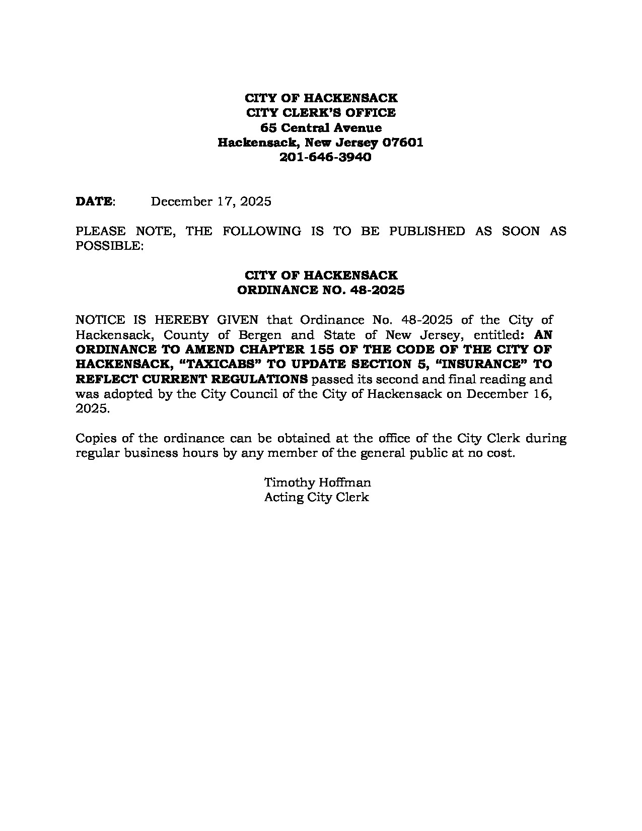 Please be advised that pursuant to New Jersey P.L. 2025, c. 72 (formerly Senate Bill 4654), the City of Hackensack will be transitioning the publication of all legal and public notices to its official website. This change is being made in accordance with new state law, which recognizes that online publication provides more accessible and cost-effective access to public information for a greater number of New Jersey residents.